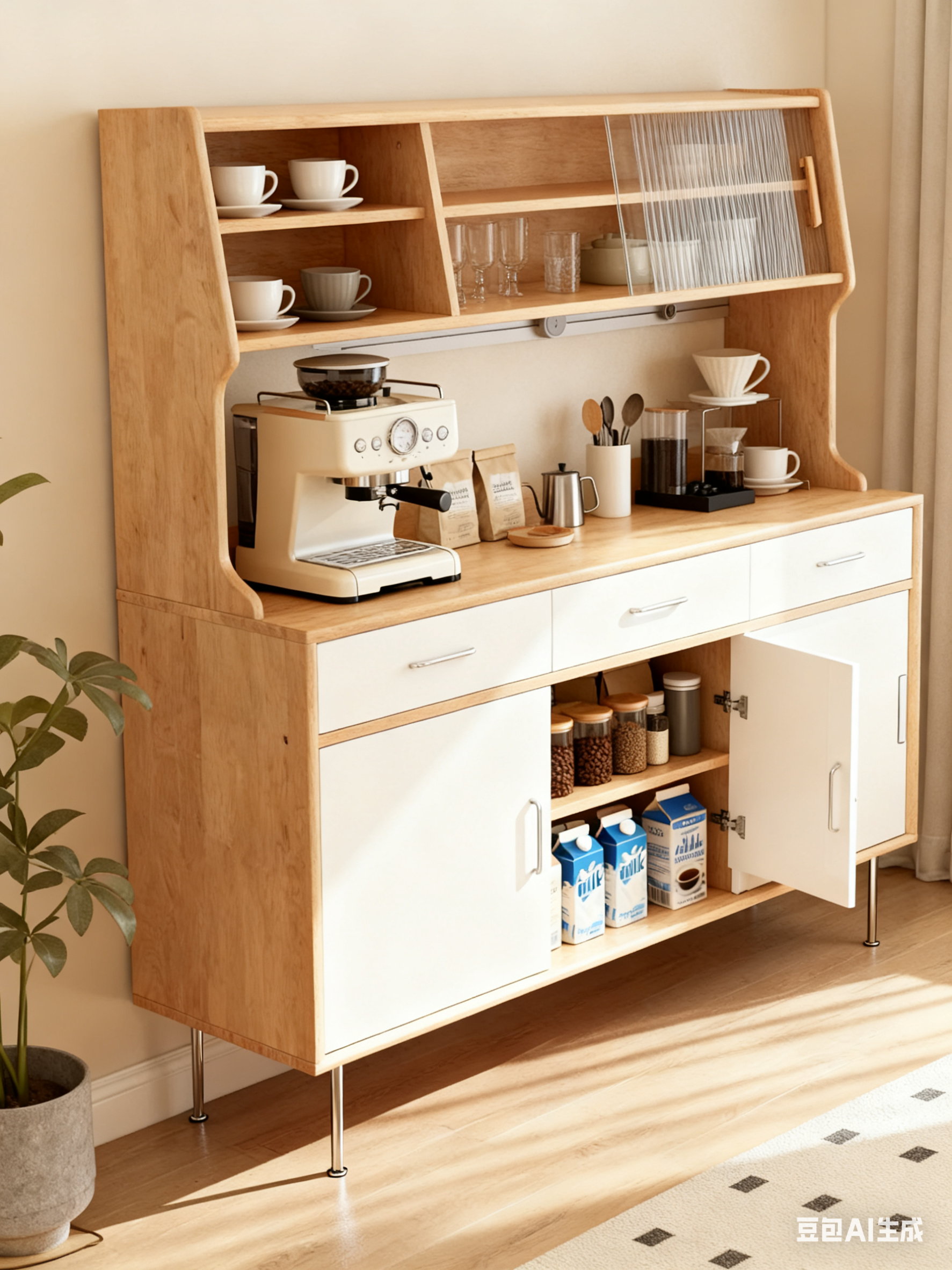 日式原木 C 字餐边柜|香港家居质感之选,专属咖啡角 + 高效收纳一步到位