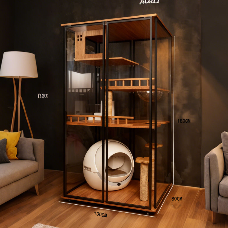 從外觀來看,它巧妙融合了現代簡約與自然質感。黑色金屬框架穩重時尚,搭配暖木色層板,無論是現代風、工業風還是輕奢風的家居裝潢,都能完美融入,宛如一件藝術品,為家增添品味細節。通透的玻璃圍欄設計,既保障貓咪活動時的安全性,又能讓主人隨時關注貓咪動態,互動零距離。