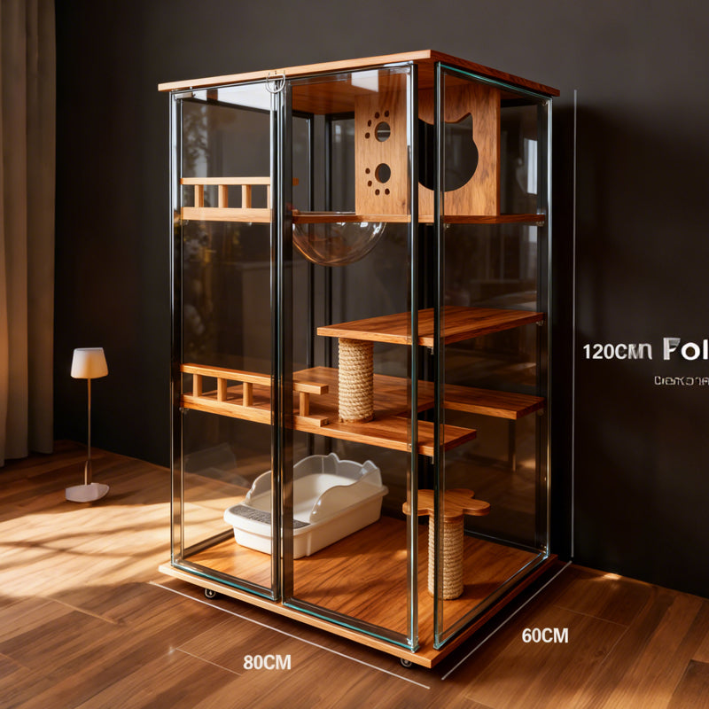 從外觀來看,它巧妙融合了現代簡約與自然質感。黑色金屬框架穩重時尚,搭配暖木色層板,無論是現代風、工業風還是輕奢風的家居裝潢,都能完美融入,宛如一件藝術品,為家增添品味細節。通透的玻璃圍欄設計,既保障貓咪活動時的安全性,又能讓主人隨時關注貓咪動態,互動零距離。