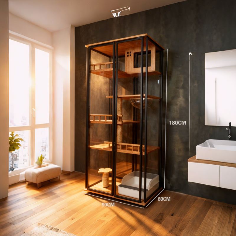 外觀來看,它巧妙融合了現代簡約與自然質感。黑色金屬框架穩重時尚,搭配暖木色層板,無論是現代風、工業風還是輕奢風的家居裝潢,都能完美融入,宛如一件藝術品,為家增添品味細節。通透的玻璃圍欄設計,既保障貓咪活動時的安全性,又能讓主人隨時關注貓咪動態,互動零距離。