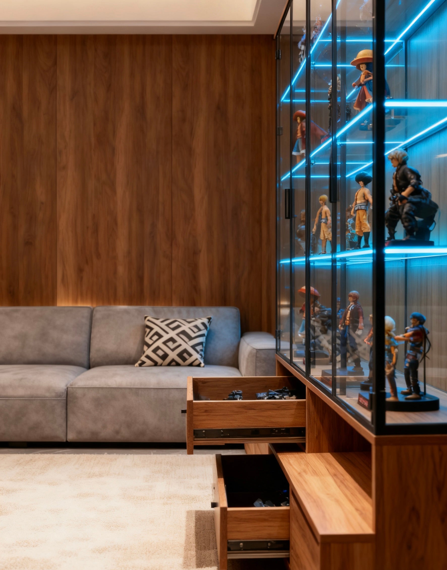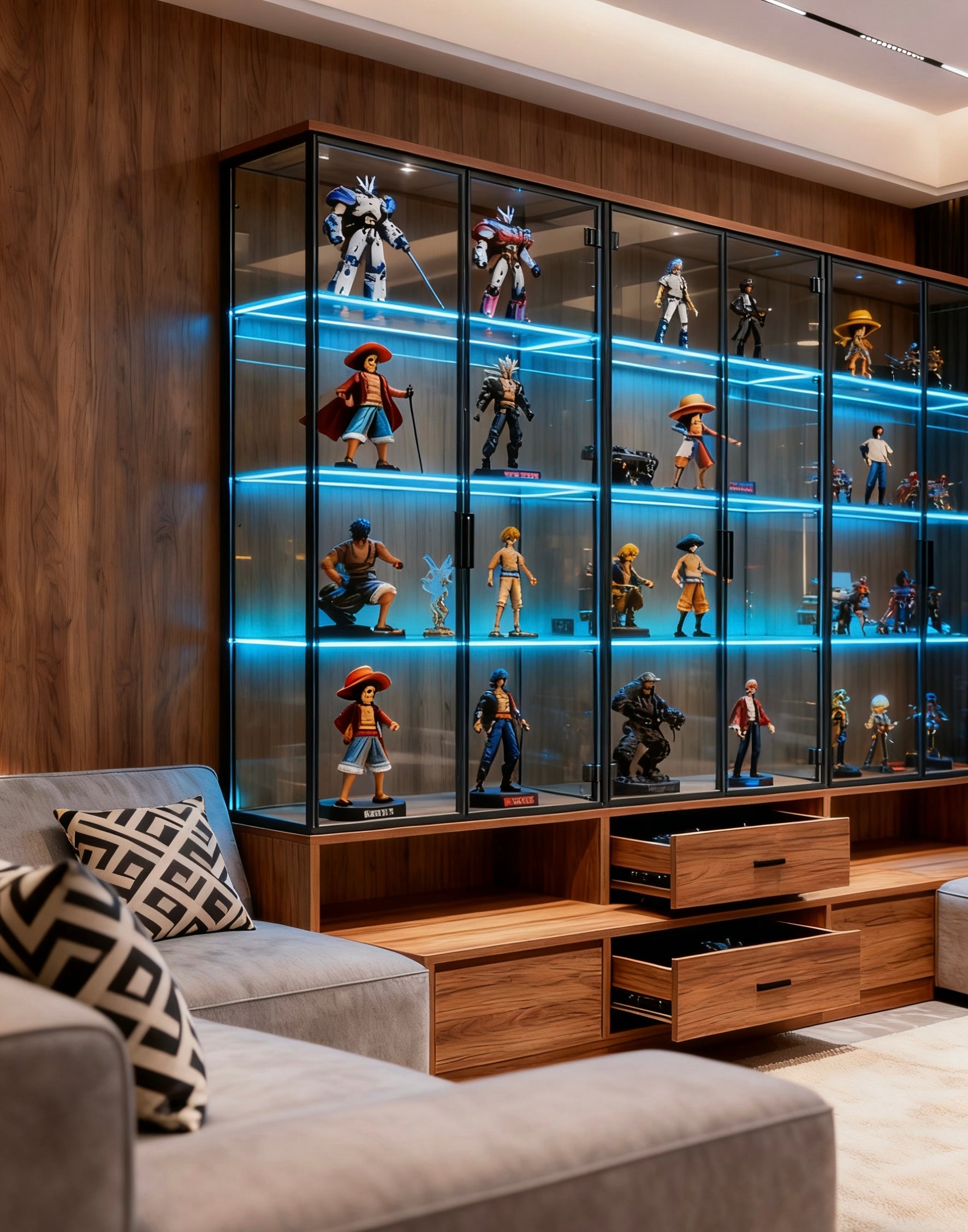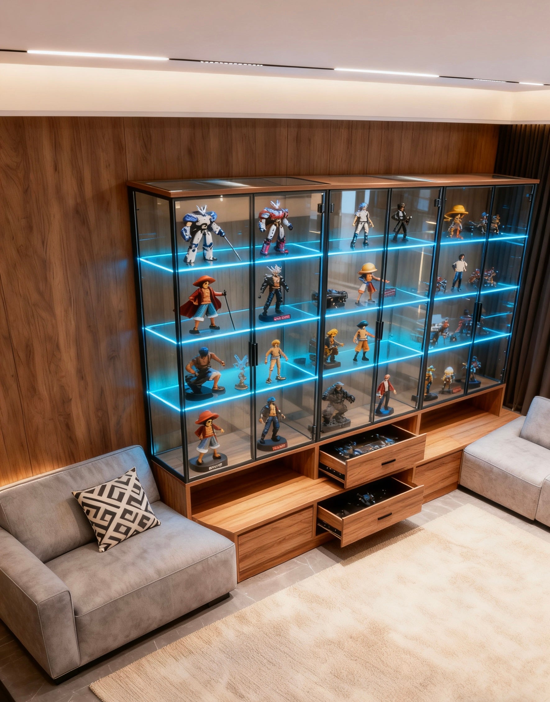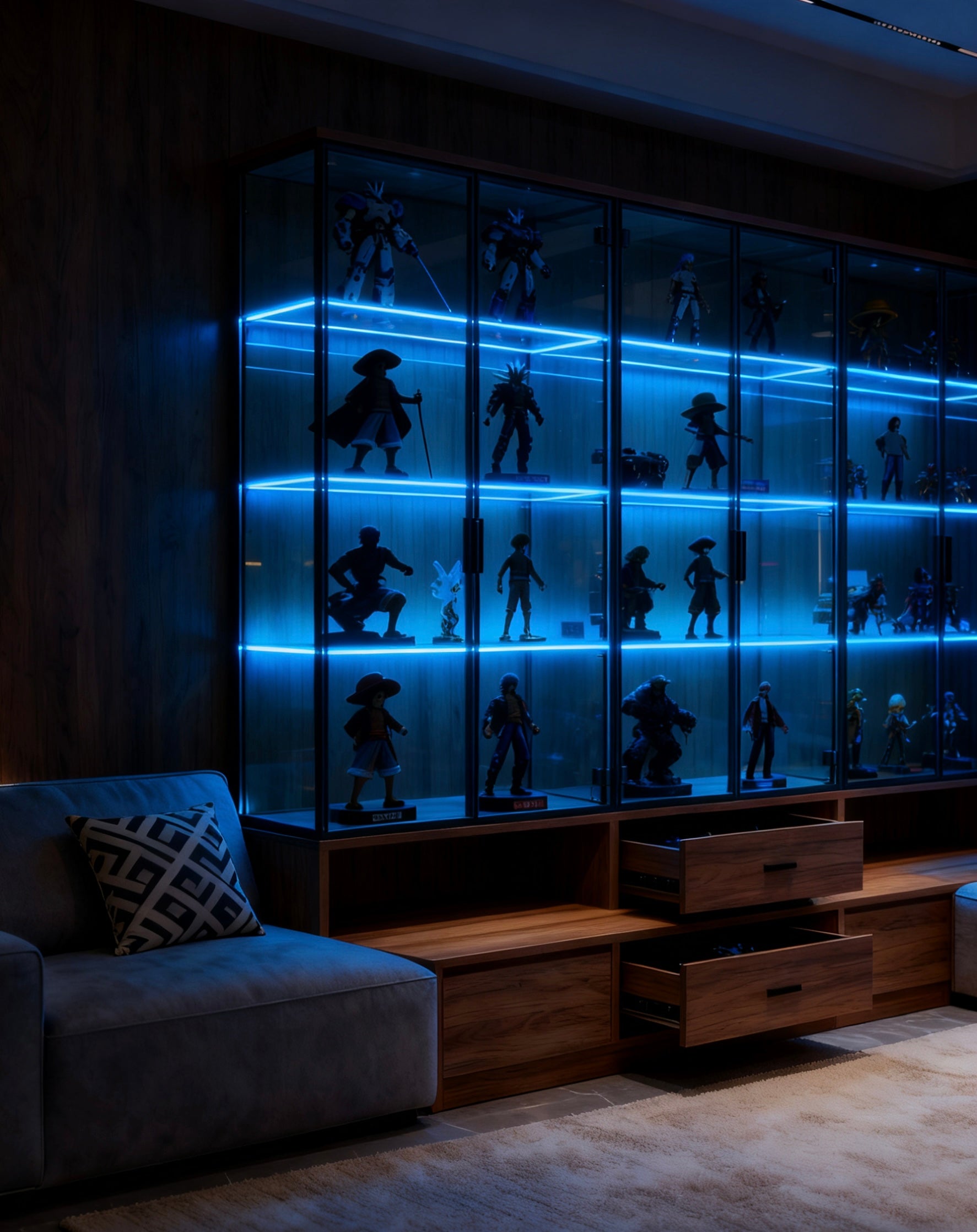 Inspired by Hong Kong style, it features walnut wood grain paired with black metal frames and transparent glass, which is low-key and textured, integrating perfectly into your home space. Layered blue LED strips highlight every detail of the models, making the mechanical sense of Gundam and the unique charm of One Piece characters instantly catch your eye! The drawers at the bottom of the cabinet can also store model accessories and peripherals, which is very practical~