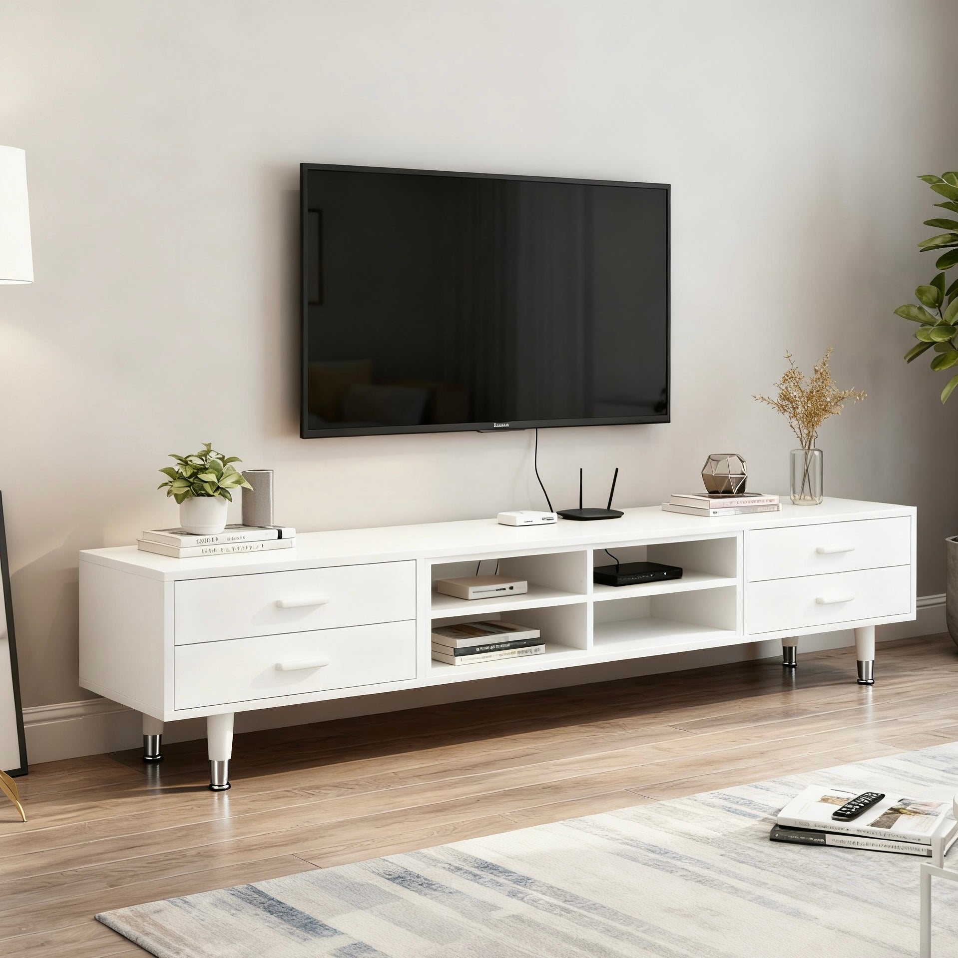 想客廳睇起身更光猛?呢款白色開放格電視櫃幫到你!全白色櫃身無金屬腳,直接貼地擺,視覺上好清爽,即刻擴大客廳空間感。上層兩個開放格,擺書、裝飾公仔或者小型音響都得;下層封閉櫃,收埋唔常用嘅雜物,整潔又靚觀。無論係唐樓定新樓,擺呢款電視櫃,客廳都會變得好有日系清新feel~