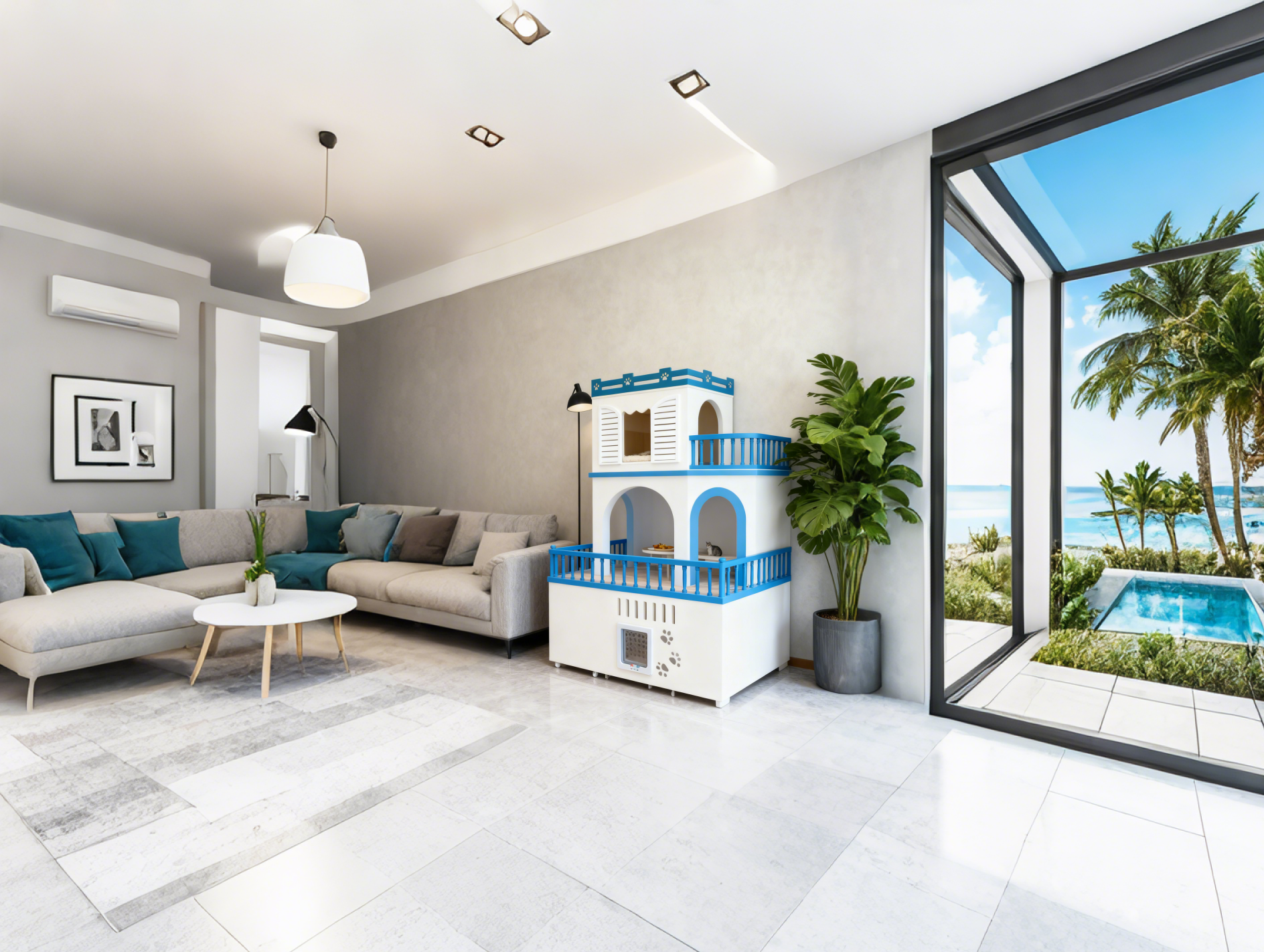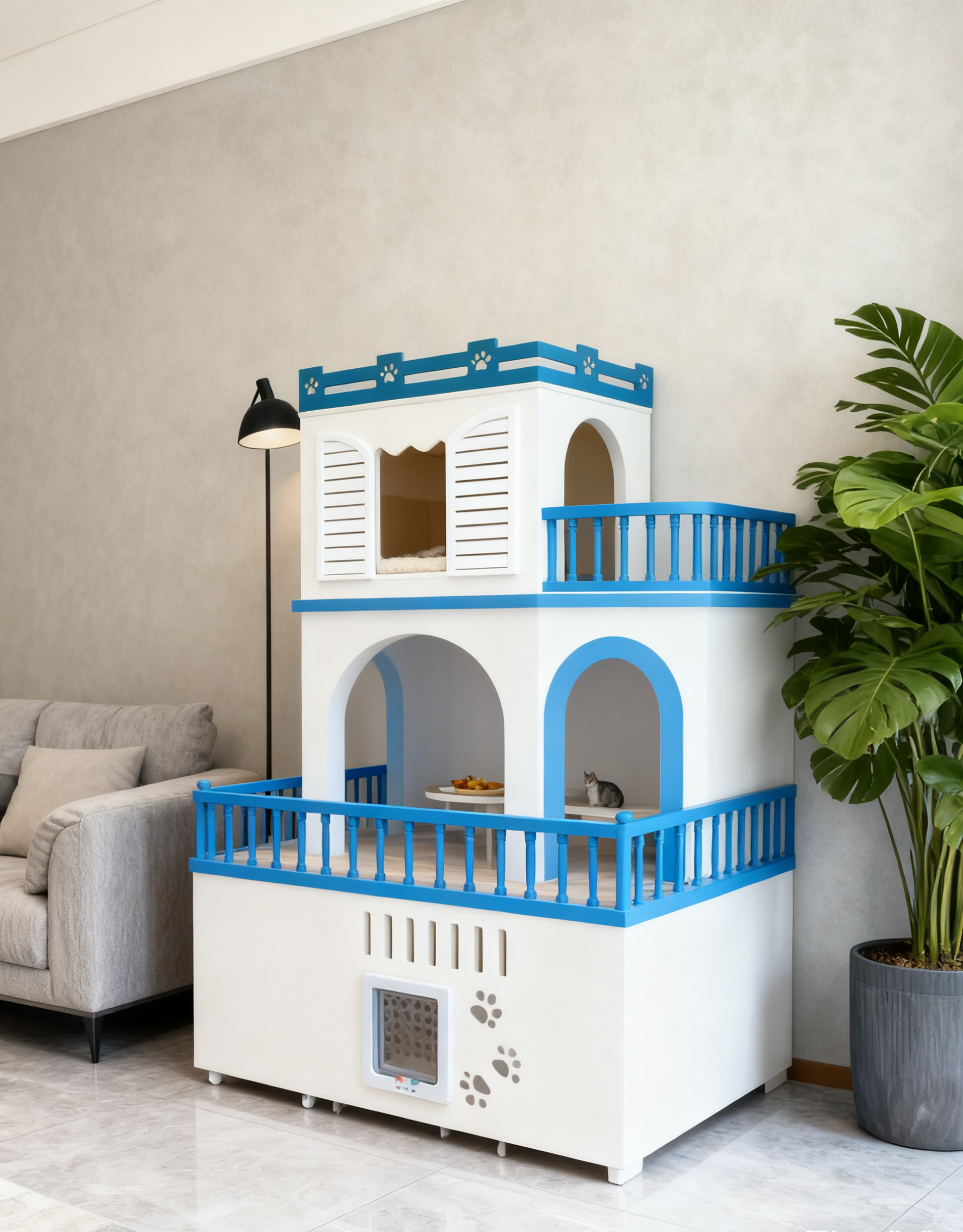 睇個白藍配色就知道好有聖托里尼 feel,陽光下一照,個色鮮明到唔捨得移開眼。多層設計超用心,底層有專屬「飯廳」,擺貓糧同水樽整整齐齊;中層係「休息室」,鋪埋軟墊,貓咪瞓响度歎世界最舒服;最頂層仲有個小陽台,貓主子可以係度望風、曬太陽,唔使成日屈喺窗台。