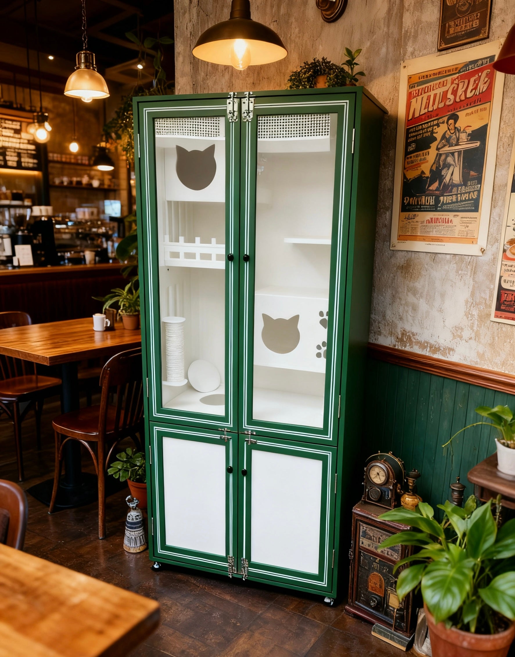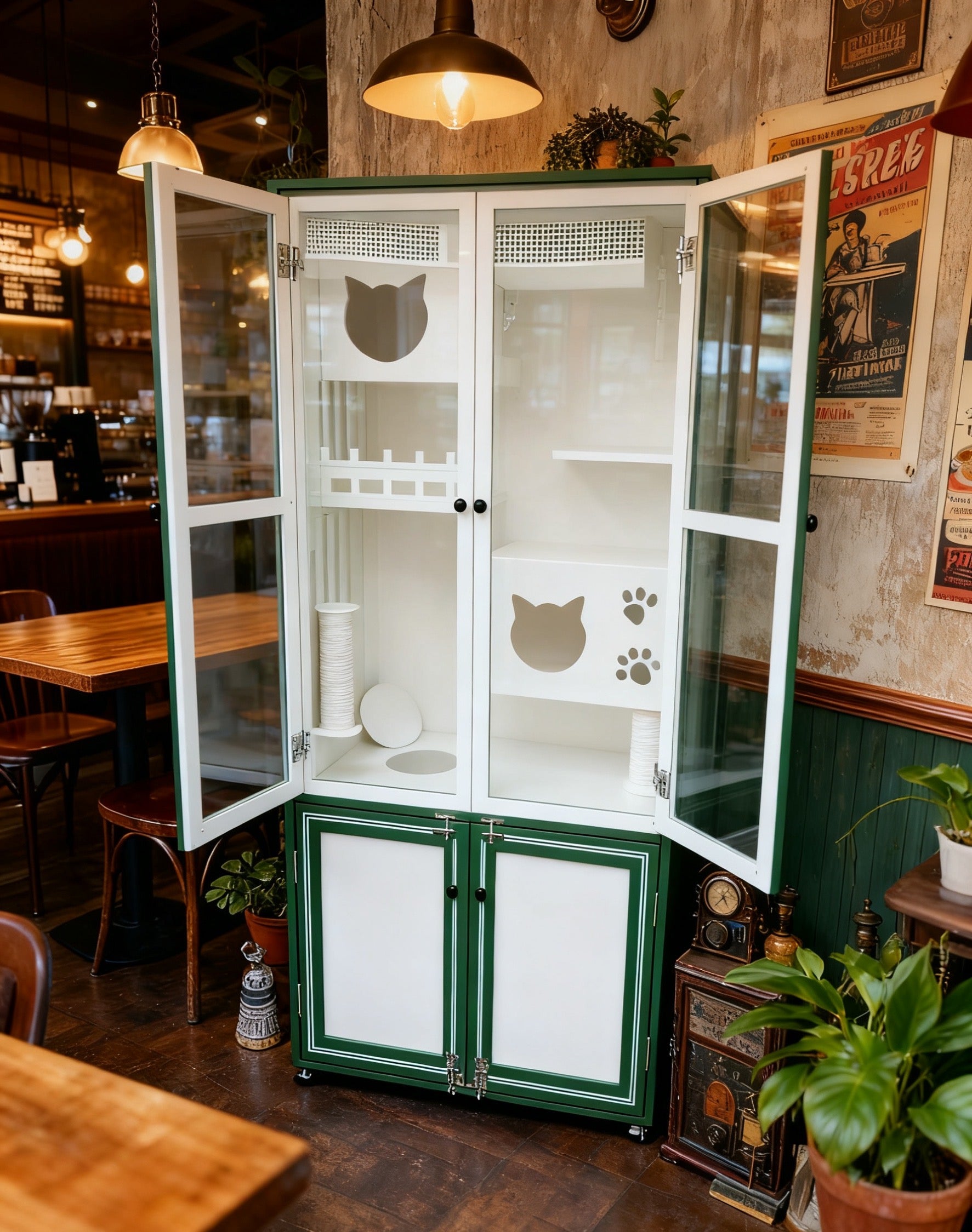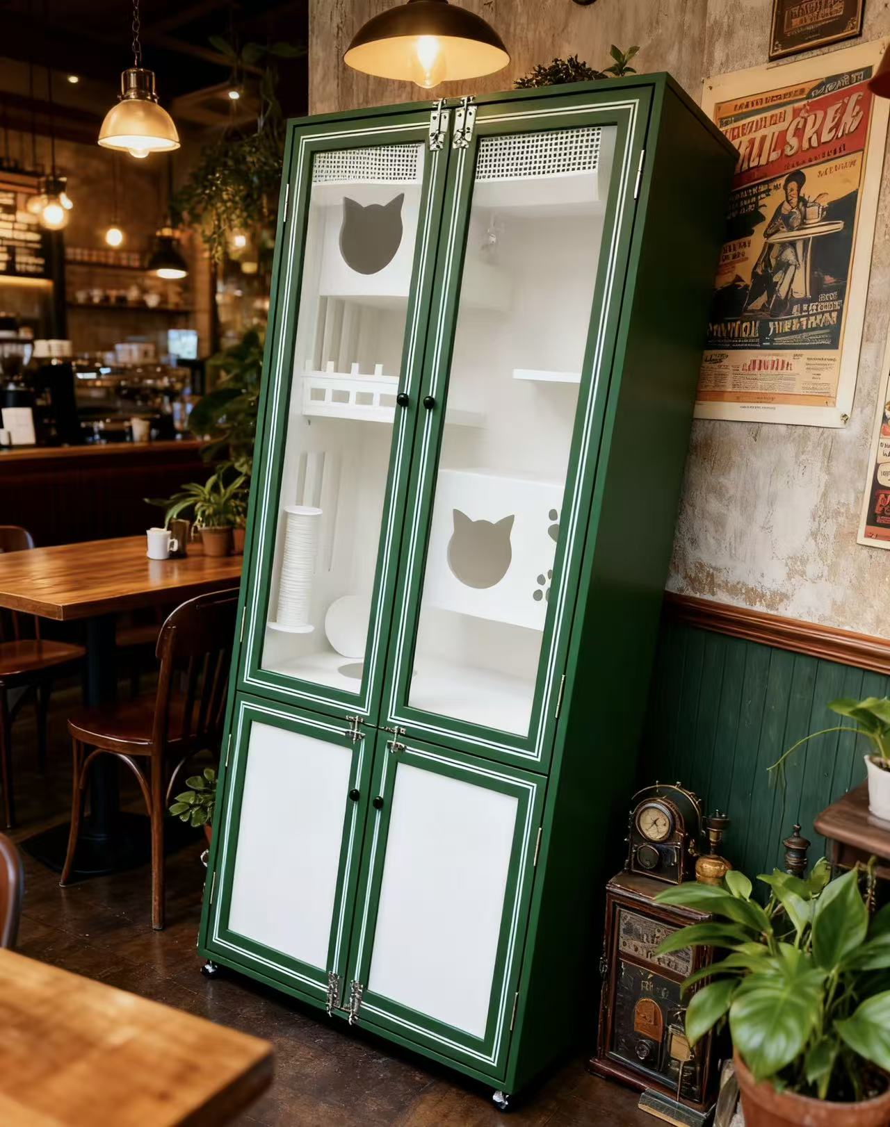 This cat cabinet is simply a dream item for cat owners in Hong Kong! Just look at how perfectly it fits into the retro-style corner of the restaurant, and you'll know how excellent the design is. Overall, it features a green and white color scheme. The green is a textured dark green, and the white lines are neat. The color contrast has a strong vibe of old Hong Kong ice parlors while also having a modern touch, perfectly matching Hong Kong people's preference for a "East-meets-West" style.