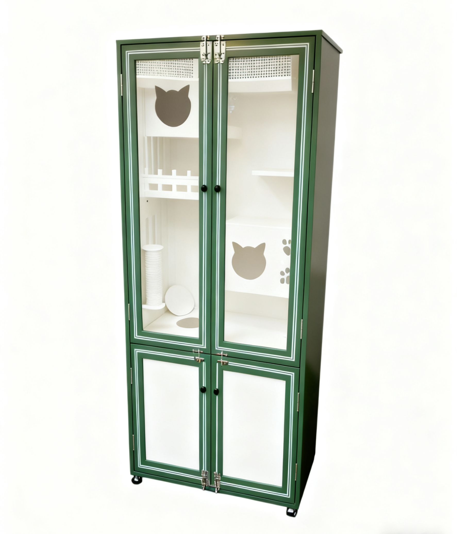 先講外觀,櫃身夠晒高,直立喺度好醒目,但又唔會太霸氣,反而係種優雅嘅存在。雙層四門設計,上層兩扇玻璃門,通透得嚟,門上仲有貓咪頭型同爪印嘅裝飾,好 Q 好可愛,滿滿都係為貓主子嘅貼心設計。玻璃質感剔透,能清楚見到裡面嘅收納格局,下層兩扇實心門,綠白搭配,穩重又清新。櫃邊嘅金屬鉸鏈同把手,做工精細,有種復古傢俬嘅精緻感,摸落去好順手,開合都好順暢,體現出製作嘅用心。